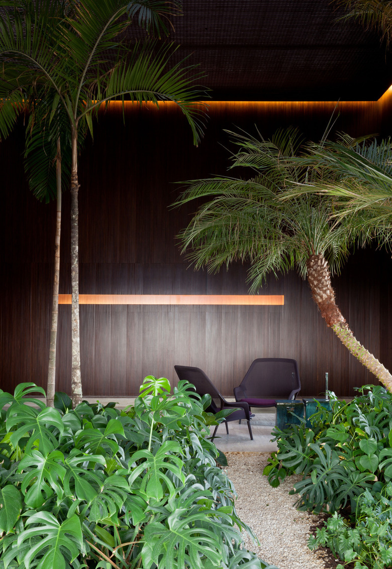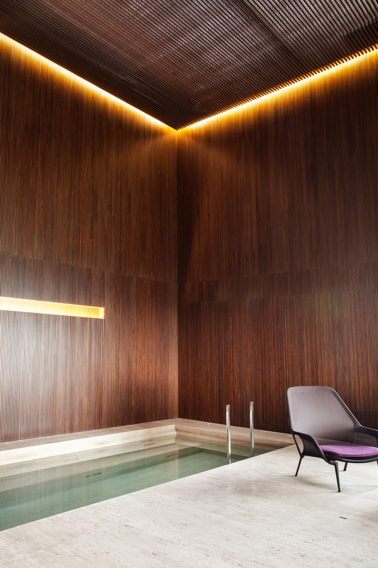 All of the spaces on the top floor have a double ceiling-height. Thus, the spa and library could be designed taking advantage of the spaciousness of the architecture in behalf of the program. Thus, the pool is positioned in continuity with a dense garden – even having small tress -, in this way creating a tropical atmosphere together with the minimalist place of bathing. The walls were made in slatted wood and the ceiling in a metallic weaved lining.