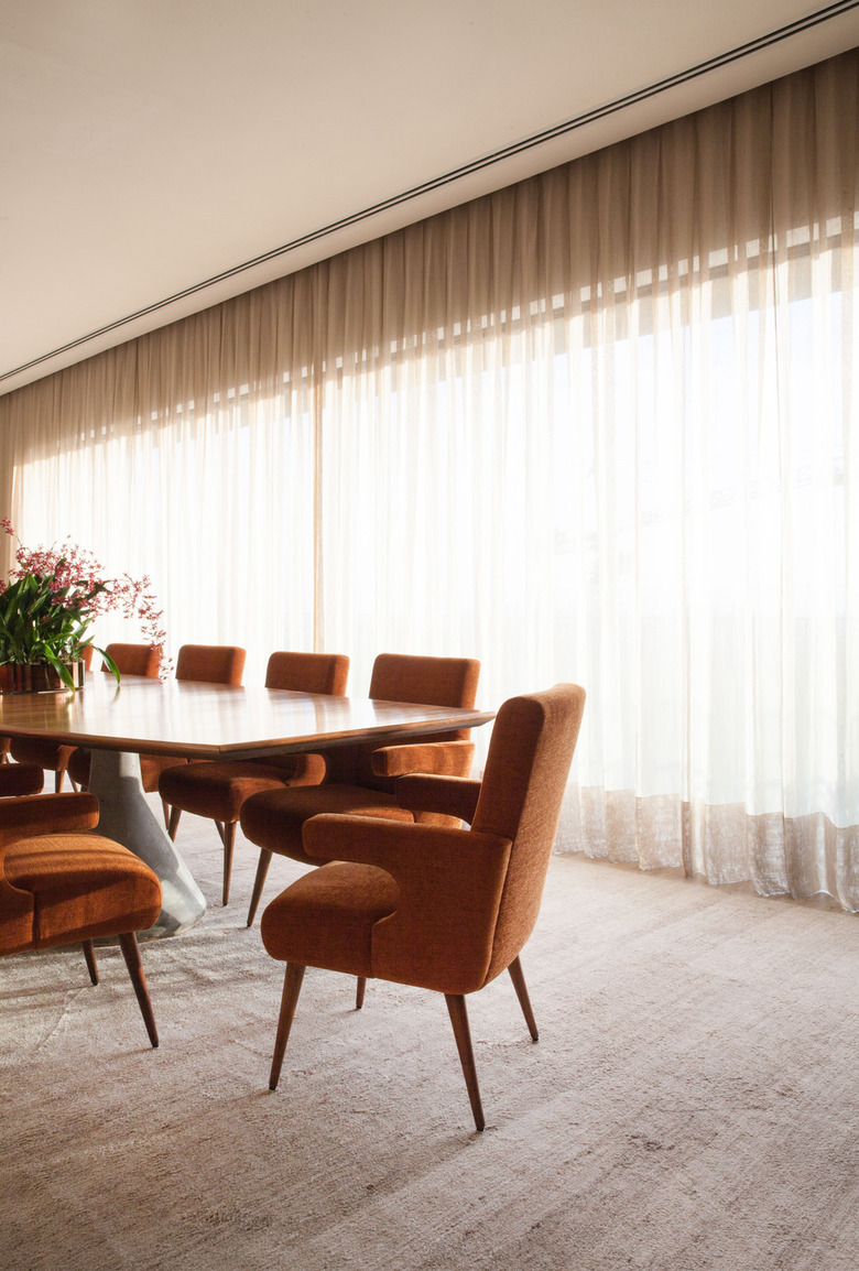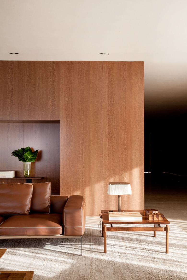 The internal surfaces were treated as continuous surfaces covered in Late terra wood panels and corten steel plaques. The floors, in turn, are of travertine marble in the collective areas and wood in the bedrooms. The colors of these materials, with ochre and beige tints, dialogue with the fabric, for example, the linen gauze curtains. The reddish tones, used also on the upholstery, ended up creating a warm feeling for the space. All the spaces received the same care in this project and tried to create surprises and emotions through a precise drawing, based on a careful architectural detailing.