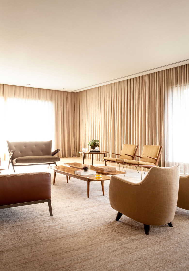 The living room layouts – with floor lighting, sofas and club chairs, as well as end tables – define pleasant spaces for social gatherings. The spaces are organized by large carpets – also in neutral colors that do not stand out too much from the floor and function as delicate markers for the activities. The lighting fixtures privileged indirect lights, such as recessed ceiling down-lights and abat-jours, complemented by some points in the ceiling next to the walls.