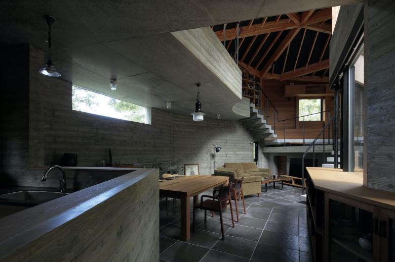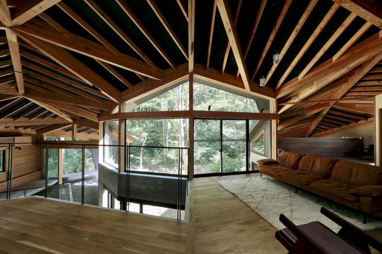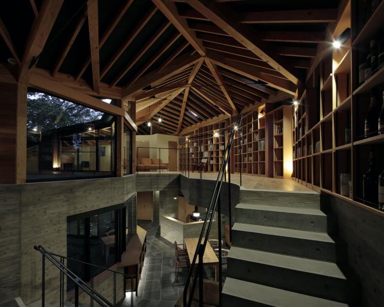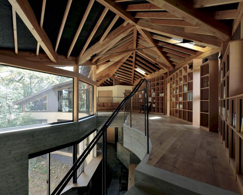 The sloped property has an elevation drop similar to that at the end of a promontory, which made the question of how to place the building on the land a structural question of ongoing concern. In order to avoid an overly large, deep foundation, we alloted about one-third of the building footprint to an overhang, thereby reducing the area of contact with the ground. The basic structure is comprised of reinforced concrete from the foundation through the floor of the second story, with wood above that. The upper level, which was conceived of mainly as a reading area, has the same footprint as the lower level, but by varying the shape of the triangular planes of the roof, we were able to maintain continuity. The peak is around the center of the building, while the two narrow end sections slope down to the first story via a mezzanine and a void. This ultimately creates the impression of a single roof covering the whole building, even though it is divided into multiple sections.