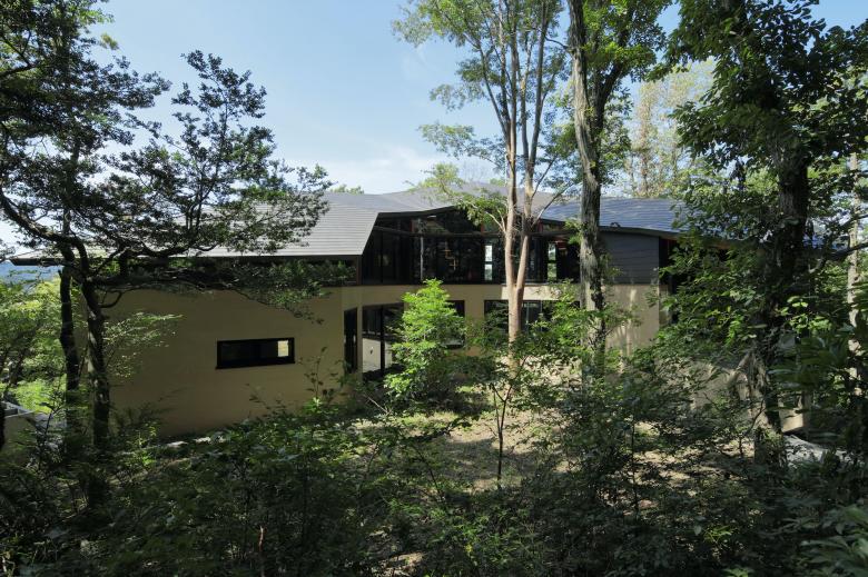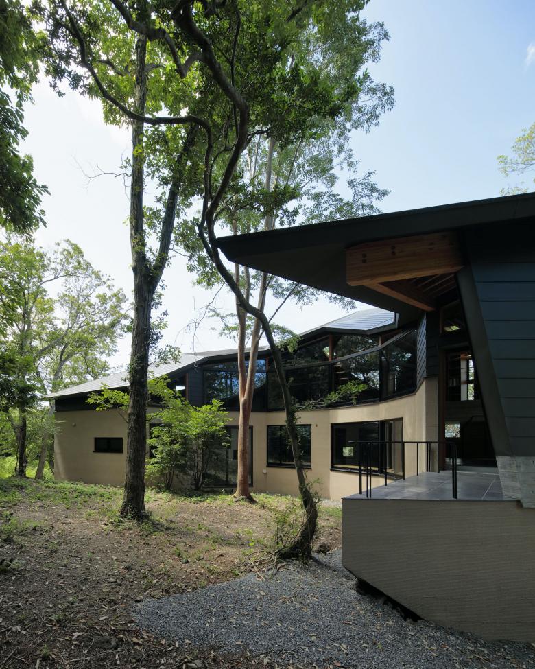 The site for this project is sloped and initially was covered in dense forest. Although the surrounding area was developed with second homes in the 1970s, this particular property had never been built on. In the process of visiting the site a number of times, we were drawn to a large orangebark stewartia tree and began searching for a way to leave it standing so that it could coexist with the architecture. Based on setback regulations and other constraints, we calculated that the tree was located near the approximate center of the area where building was possible. We therefore moved forward with a design that wraps around the tree, giving it the space it needs while still creating a relationship with it.