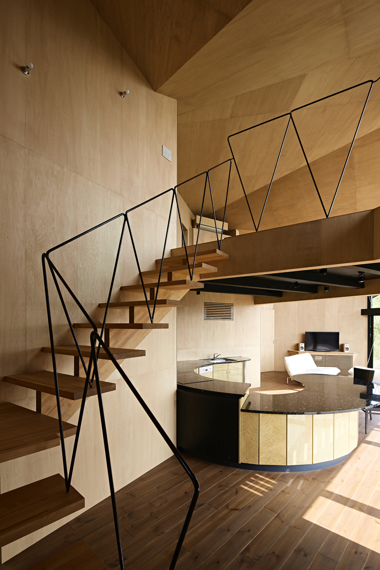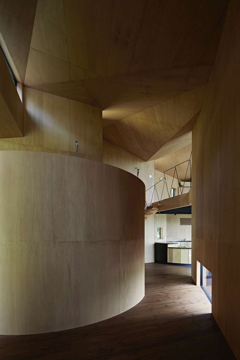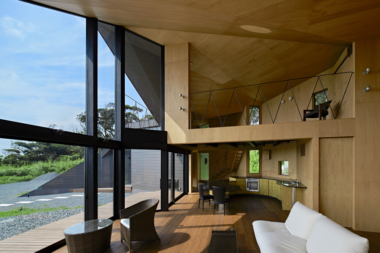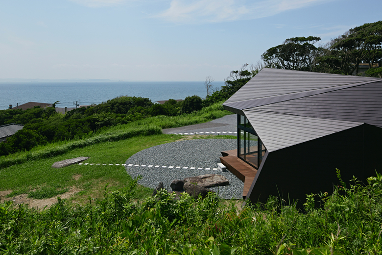 After entering the entrance along a triangular side wall, the outdoor view is temporarily shut off and people find themselves in a gradation of light. There is a folded-plate space that rises towards the second floor, and a semicircular bathroom is placed in the space. By going towards the light while feeling a contrastive structure, a wide-open ocean view enfolds. When entering the living room, the view widens even more in a longitudinal direction to the sky. After the place with a tall framed scenic view, the view become rapidly narrower and then lands beyond the bathroom area once again. The interior sequences are handled as if they are melodies, and the spaces are connected as if accumulating harmonies.