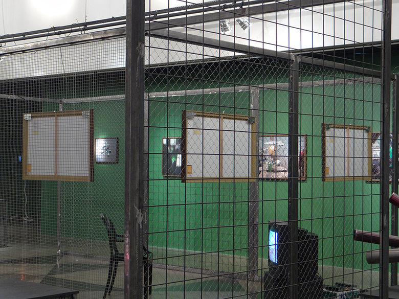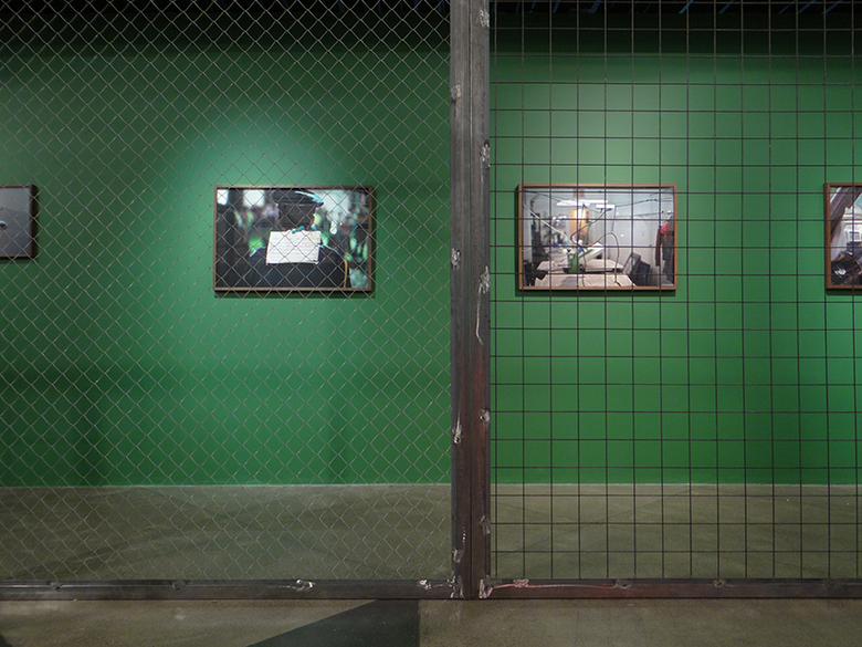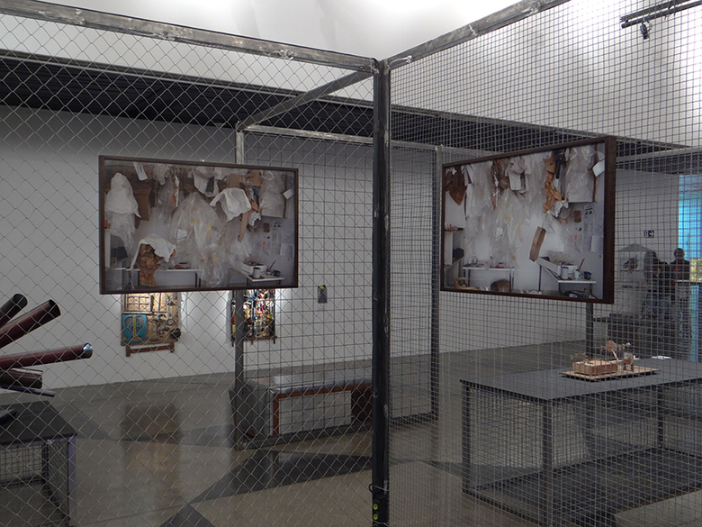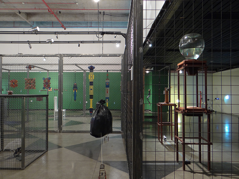 The exhibition design, by Vazio S/A, seeks not to compartmentalize the exhibition hall. Avoiding the idea of separate works in closed, white environments – a common solution in exhibitions of many works and little space – the show has its works juxtaposed in a continuous space. The metal meshes on which the works are hanged do not separate them in rooms, thereby creating a visual overlay of objects and screens that confirms the curator’s concept of accumulation and collage.