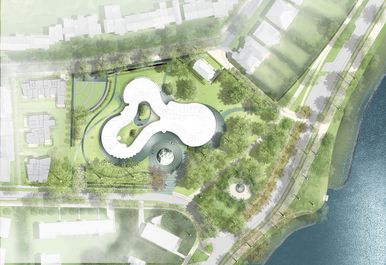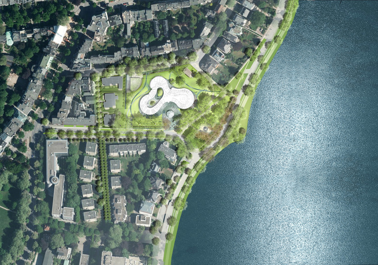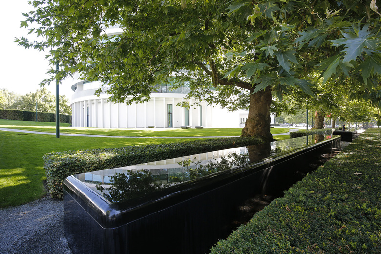 Das Grundmotiv sind sanft und ruhig geschwungene Rasenflächen, bestanden mit malerischen Parkbäumen. Nach Norden, Süden und Westen rahmen lineare Hecken-Parterres das Grundstück und bilden den stadträumlichen Anschluss. Eines der drei Objekte ist ein hochglanzpoliertes Steinelement, das die Reflexion des Lichtes, des Wassers und des Himmels verstärkt und eine reduzierte Assoziation an die herrschaftlichen Parterre-Anlagen historischer Villen und Schlösser bildet.