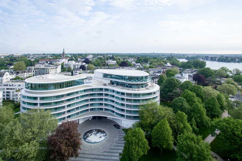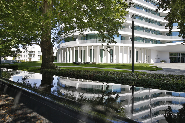 Basierend auf den Kreisgedanken der architektonischen Struktur, bildet ein leicht erhöhtes, rundes und reflektierendes Wasserobjekt das Zentrum des Vorplatzes. Gemäß der Philosophie des Grandhotels The Fontenay „Exklusivität und Luxus müssen nicht dick aufgetragen sein und dürfen nicht sofort ins Auge springen“ schafft die zurückhaltende, gleichzeitig präzise definierte Konzeption der Außenanlagen eine einzigartige, durchaus poetische, Atmosphäre, die Luxus und Eleganz zeitgemäß spürbar macht.