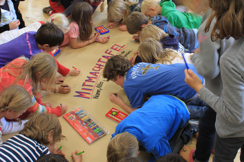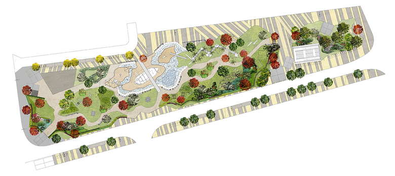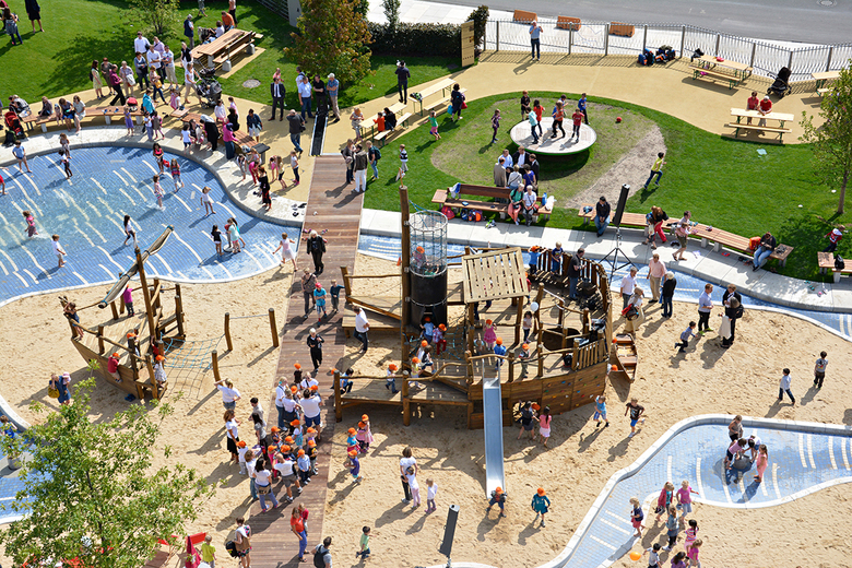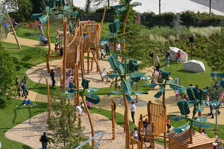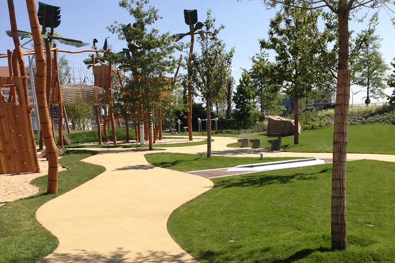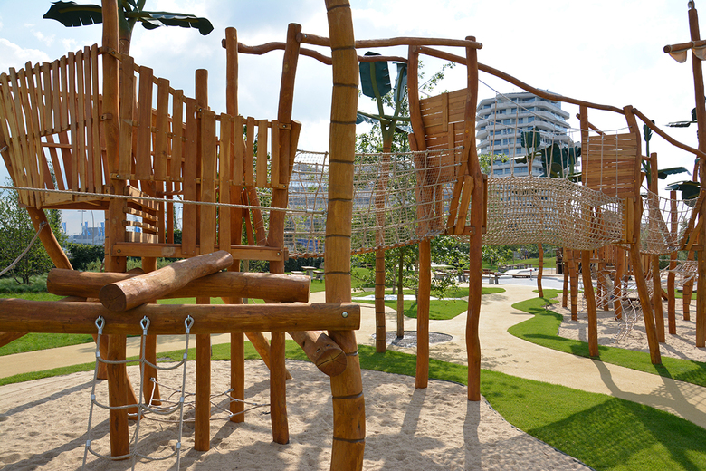 Bereits bei der Entwurfsplanung haben Kinder, Jugendliche und Anwohner im Rahmen eines Beteiligungsverfahrens intensiv an der Gestaltung mitgewirkt. Die Ideen aus der Bürgerbeteiligung sind als Palmenkletterwald mit Baumhaus, Rutsche, verschiedene Hängebrücken und Kletterplateaus sowie als generationsübergreifendes Spielefeld mit Ganzkörpertrainern umgesetzt. Ein Kleinkinderspielbereich mit Sandfläche und Matschtisch ergänzt das breite Angebot für mehrere Altersgruppen.
