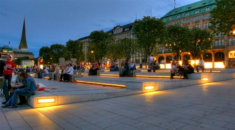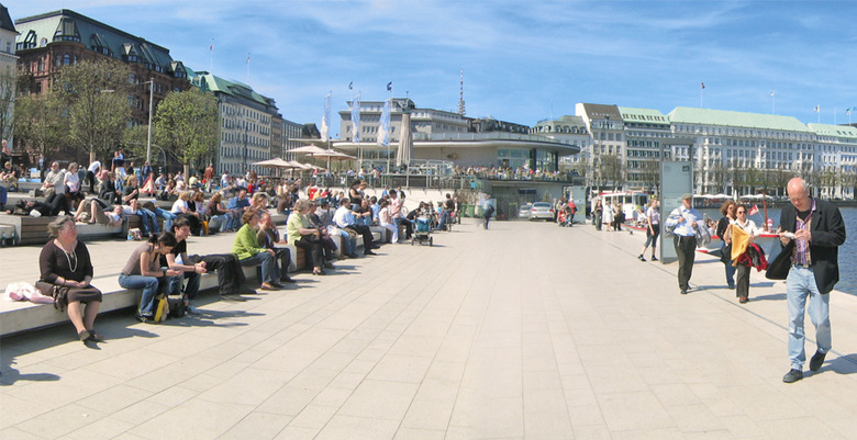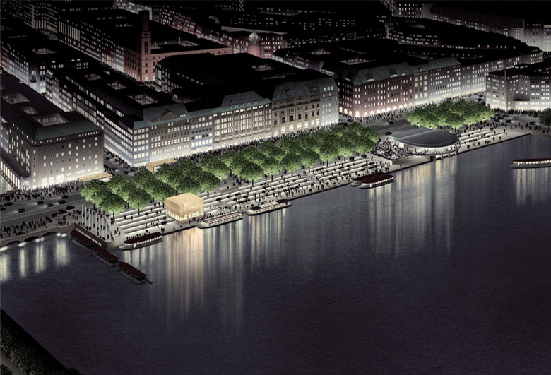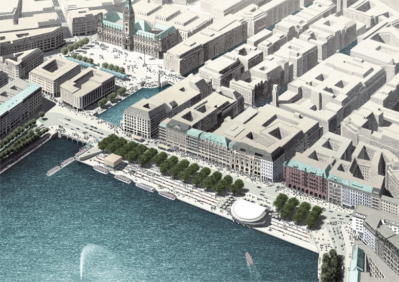 Die Jury des internationaler Wettbewerbs der Stadt Hamburg hat unseren Entwurf wie folgt kommentiert: Der „Lösungsvorschlag ist klar und einfach, jedoch nicht ohne Raffinesse: Der Alsteranleger wird durch eine großzügige, die gesamte Breite des Jungfernstiegs einnehmenden Treppenanlage ersetzt, die bis zum Wasser reicht und vielfältige, bewegliche Sitzgelegenheiten bietet. Im Kontrast zur flach gehaltenen Treppenanlage erhält der Jungfernstieg wieder eine klar konturierte, dreiachsige Lindenallee auf der Wasserseite, die die Promenade rund um die Binnenalster fortsetzt , aber durch kastenförmigen Beschnitt und Anordnung auf Lücke doch diskret heraushebt und dauerhaft den Blick auf die dahinterliegenden Fassaden partiell zulässt. Mit diesen wenigen, aber entscheidenden Eingriffen gelingt es mit letztlich unprätentiösen Mitteln, dem Jungfernstieg wieder eine klare Gliederung in einen Boulevard auf der bebauten Seite, eine großzügige Promenade auf der Wasserseite und einen Aufenthaltsbereich zum Alsteranleger hin zu geben. Es gelingt (WES) nicht nur, an die historische Gliederung des Jungfernstiegs anzuknüpfen, sondern auch ein neues Bild von selbstverständlicher und unaufdringlicher Schönheit zu erzeugen.“