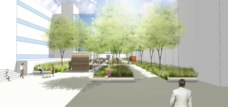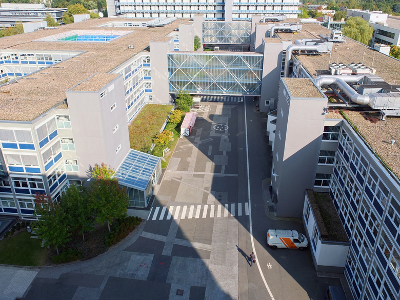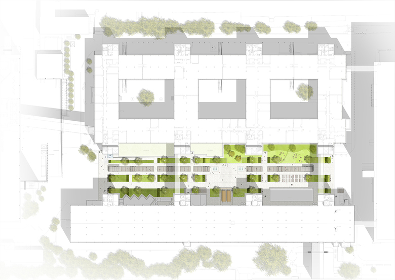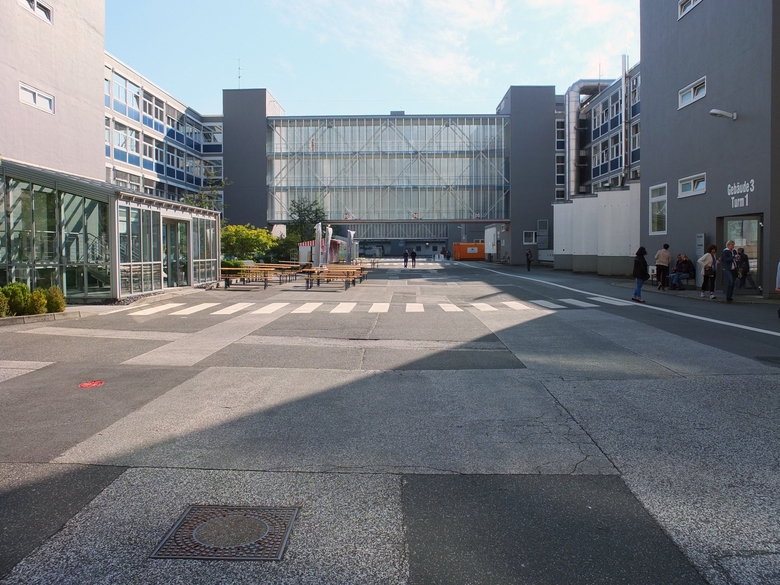 Den ersten Campus-Baustein stellt der neue Boulevard zwischen den funktional sachlich geprägten Gebäuden 2 und 3 dar; deren Klarheit und die Linearität des Raumes haben wir durch linearer Pflanzstreifen als Boulevardraum weiterentwickelt.