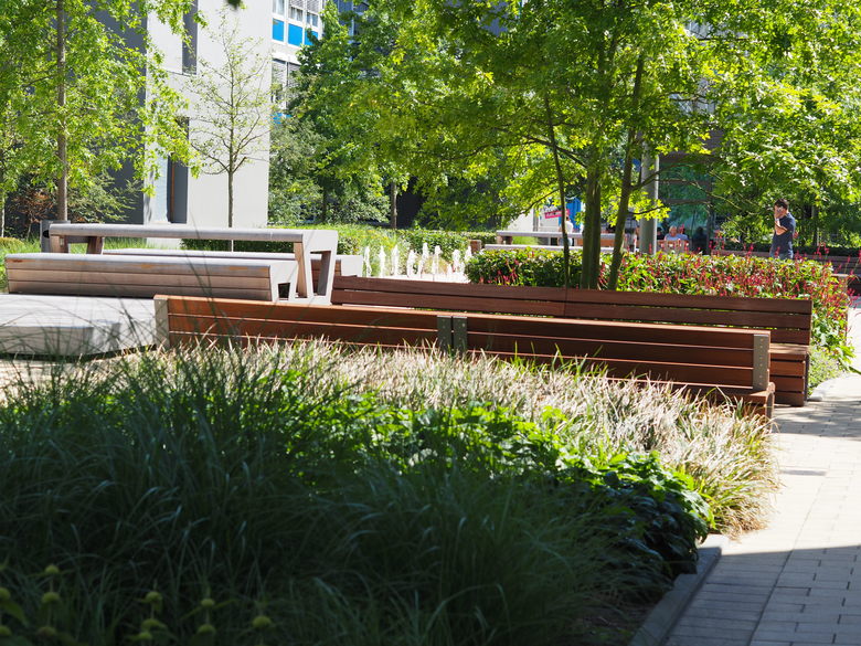 Die Pflanzstreifen werden in rhythmisierender Abfolge mit Stauden, Gräsern und Hecken bepflanzt und bieten ein jahreszeitlich wechselndes Bild. Schattenspendende Boulevardeichen, im lockeren Raster gepflanzt, überstellen den Boulevard.