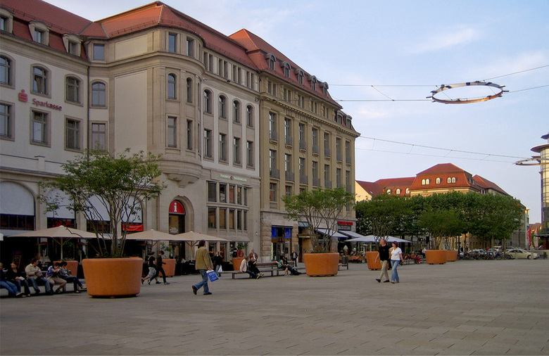 Der Belag ist leicht glänzend wie ein Parkett, drei abgehängte große Kronleuchter schweben über dem „Saal“, der zu einer Seite zurückhaltend von langen und reduzierten Sitzbänken gefasst wird. Der Willy-Brandt-Platz ist jetzt – zeitgemäß interpretiert – eine große Bühne der Stadt.