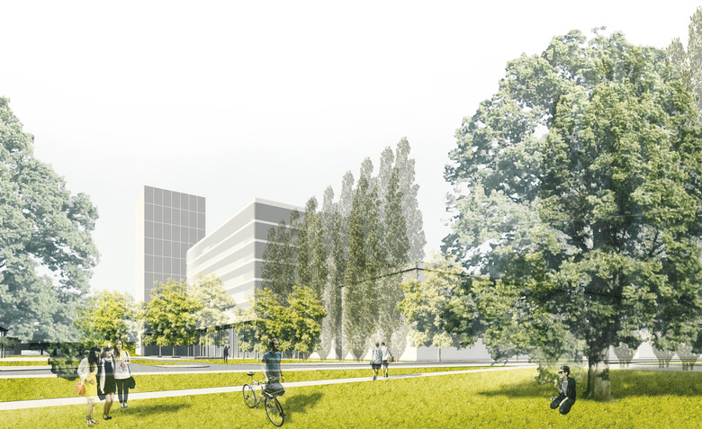 Der Botschaftspark erstreckt sich auf ganzer Länge zwischen dem baulich gefassten Place Pingusson im Osten und dem Roonpark im Westen. Er wird weitestgehend der Öffentlichkeit zugänglich gemacht. Sicherheitsrelevante Bereiche können durch Einfriedung und Wassergrenzen abgeschirmt werden. Ein Erweiterungsbau (Ministerien) beschließt die Kepplerstraße, fasst den Platz und schirmt ihn von der Autobahn ab. Durch lückenlosen Schallschutz wird der Botschaftspark zur Ruheinsel. Sensible Einbauten im Bereich der Pilotis (Café / Bistro / Meeting Points) mit Orientierung zur sonnigen Wasserterrasse schirmen zur A 620 ab und erhöhen die Qualität der Arbeitsplätze des Kultusministeriums.