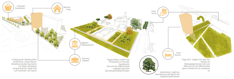 Repräsentative Plätze und signifikante bauliche Hochpunkte prägen als Haupteingänge ein neues, progressives Bild des Quartiers: Alt-Saarbrücken, ein Stadtteil des 21. Jahrhunderts.