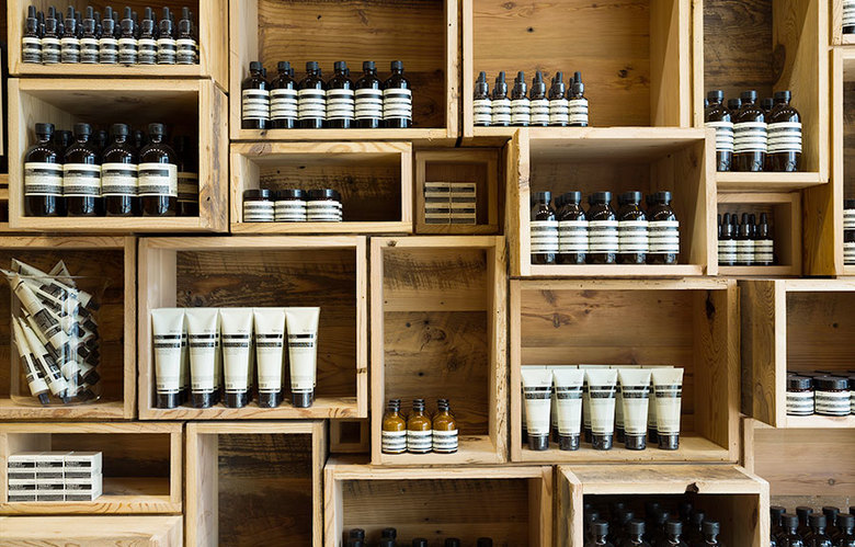 The opposing wall is clad in cork--pure, seamless and unfettered by any intricacy. Using the strict repetitive organization of the Aesop bottle-- a leitmotif of the brand-- the random stacking of boxes acts to downplay the regimented nature of the brand.