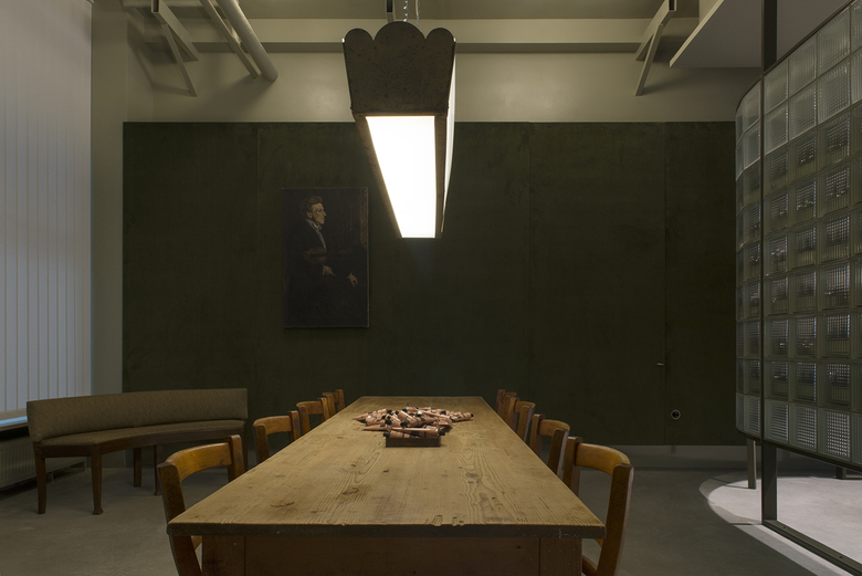 Neben der Betonfassade dominieren im Laden grün- und grauschattierte Wände mit Regalen aus pulverbeschichtetem Metall und Glasfliesen, welche auf Leipzigs Industriegeschichte anspielen, als Demarkationslinien Ost und West strikt voneinander trennten. In wunderbarem Gegensatz dazu ist der Präsentiertisch aus geöltem Plywood mit abgerundeten Kanten gefertigt; er bildet das Herzstück des Ladens, um Besucher willkommen zu heißen.