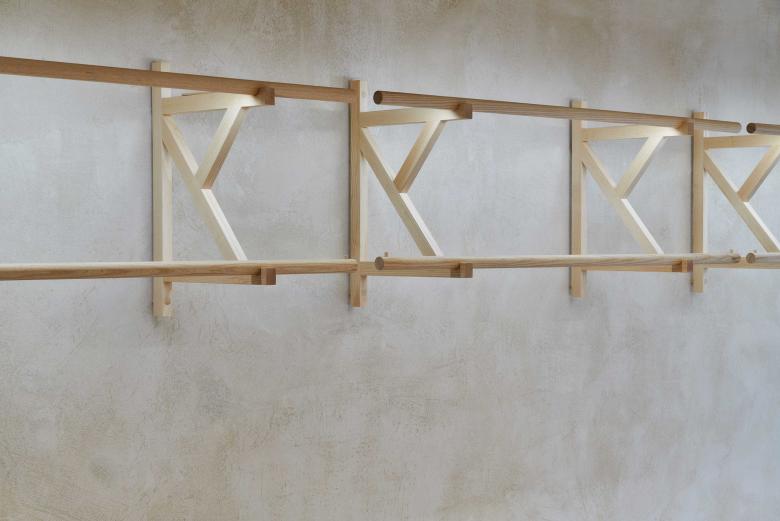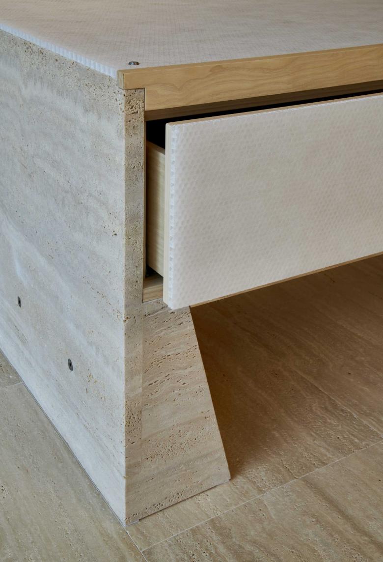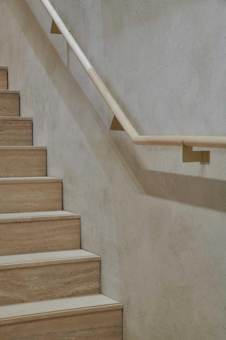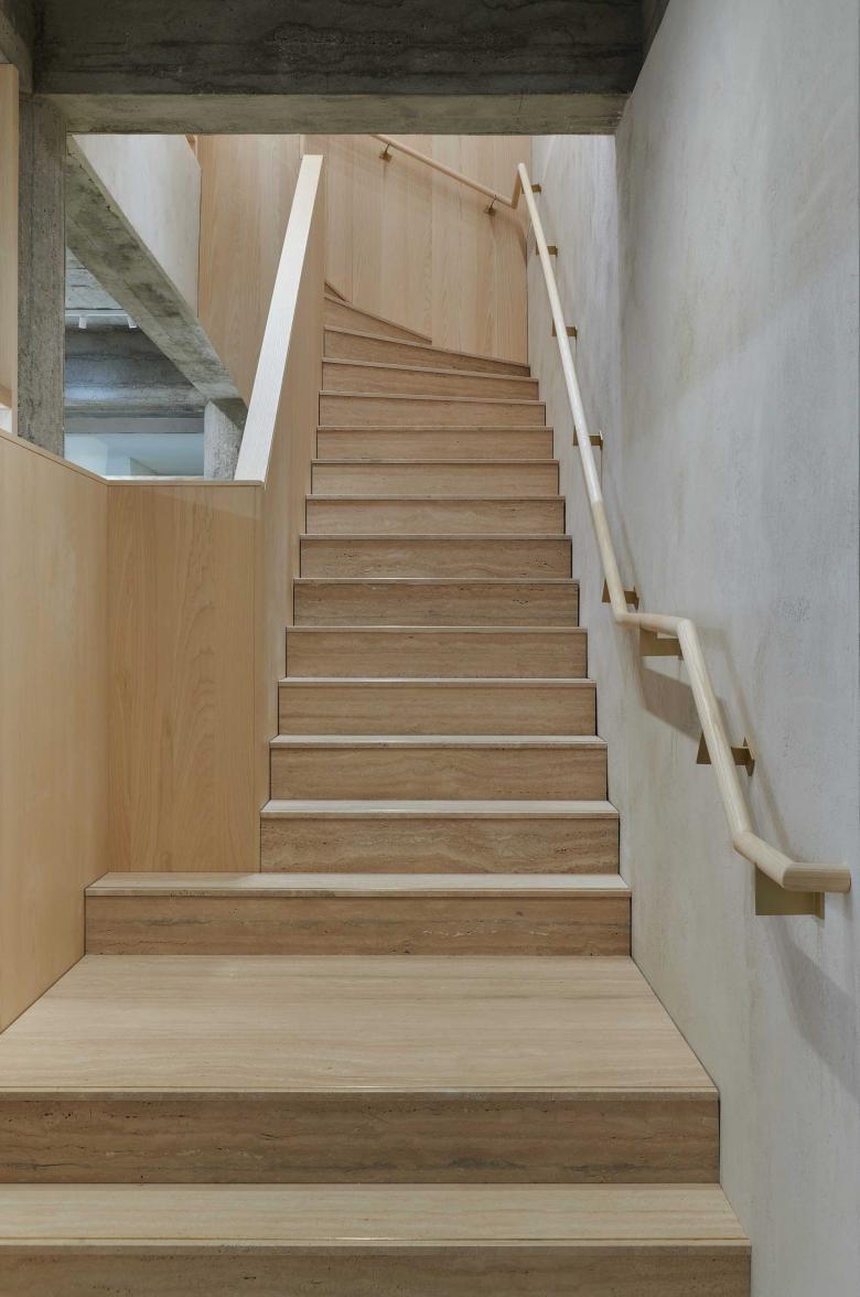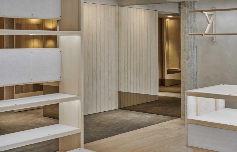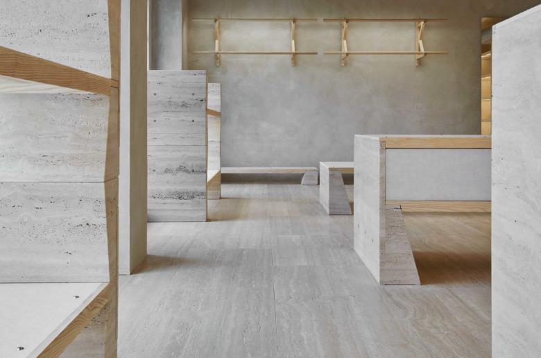 1zu33 had the role of local architect in developing Munich’s first A.P.C. store, designed by Parisian architect Laurent Deroo. Adjacent to the Aesop shop in the historic Luitpoldblock, this space equally exposes its raw concrete. The floor is laid out in Roman travertine, while the staircase balustrade and furniture are executed in light ash wood, patterned in a delicate mix of motifs and designs.