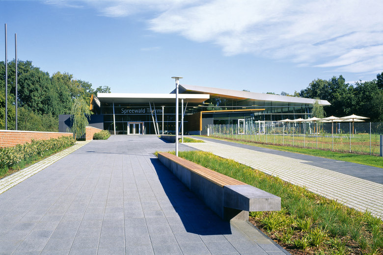 Prägendes Element der Kulturlandschaft Spreewald ist ein weit verzweigtes Netz aus Kanälen, so genannte Fließe, die zu beiden Seiten dicht mit hohen Bäumen bewachsen sind. Auch das Grundstück für die Spreewald Therme außerhalb von Burg wird durch „grüne Wände“ räumlich begrenzt. Die Bade-, Sauna- und Wellnesslandschaft greift die prägenden Elemente der Kulturlandschaft auf. Mit seinem spezifischen Erscheinungsbild bezieht sich das Gebäude ausschließlich auf den Ort Burg im Spreewald und erhält dadurch unverwechselbaren Charakter. Klare Formen und ausgewählte Materialien bestimmen die Komposition des Raumgefüges. Material- und Farbwechsel setzen besondere Akzente im Innenraum und verleihen der Therme eine warme Atmosphäre, die durch den Einsatz von Holz bei Konstruktionen und Verkleidung noch verstärkt wird. Der Bezug zum Ort wird zudem durch eine sensible Materialauswahl hergestellt. Beispielsweise unterstreicht die Verwendung von ortstypischen Materialien wie Reet, Holz und Ziegelsteinen die architektonische Verbindung der Therme mit der Region Spreewald.