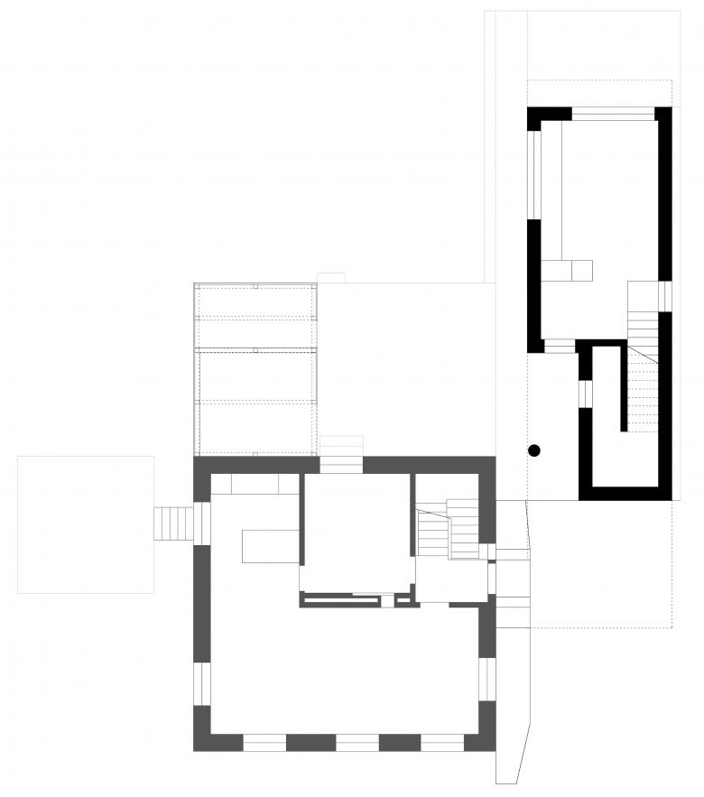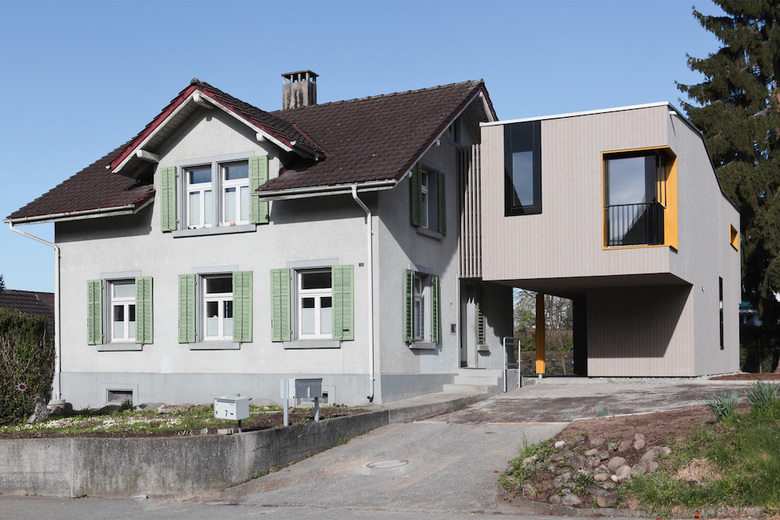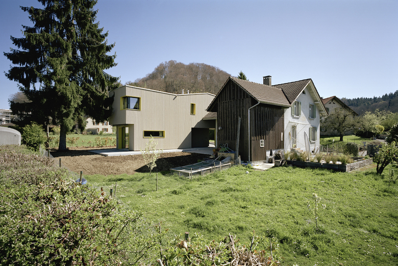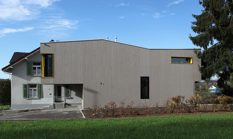 Das Dach zeichnet eine eigenständig bewegte Geometrie. Sie gewichtet die Raumproportionen im Obergeschoss und spielt zeitgemäss mit der Dachlandschaft des bestehenden Wohnhauses zusammen. Die beiden Gebäude sind im Obergeschoss punktuell miteinander verbunden. Mit der Andockung können die beiden Wohnungen bei Bedarf auch als eine benutzt werden.