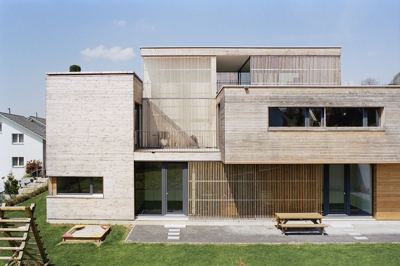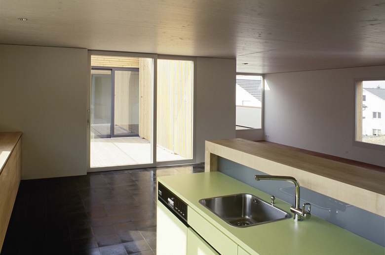 Das Wohnhaus, inmitten eines Einfamilienhausquartiers gelegen, setzt sich aus drei, sich im Grundriss unterschiedlich ausdehnenden Raumkonfigurationen zusammen. Die räumlich entstehende Intensität erzeugt eine Verschmelzung des Innen- und des Aussenraumes.