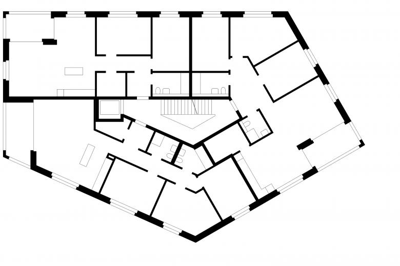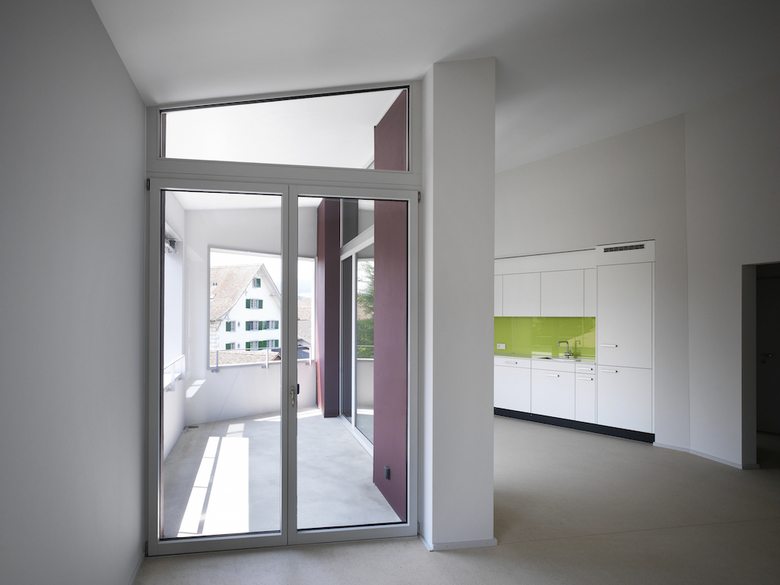 Die Wohnungen werden über ein zentrales, innenliegendes Treppenhaus erschlossen. Die Grundrisse sind in Schichten aufgebaut: Eingang, Reduit und Nasszellen bilden die innere Schicht, auf die Korridore folgt die Zimmerschicht. Alle Wohnungen haben an den Gebäudeecken attraktive Loggien. Die Wohnungen unter dem ansteigenden Dach profitieren von einem überhöhten Wohnbereich.