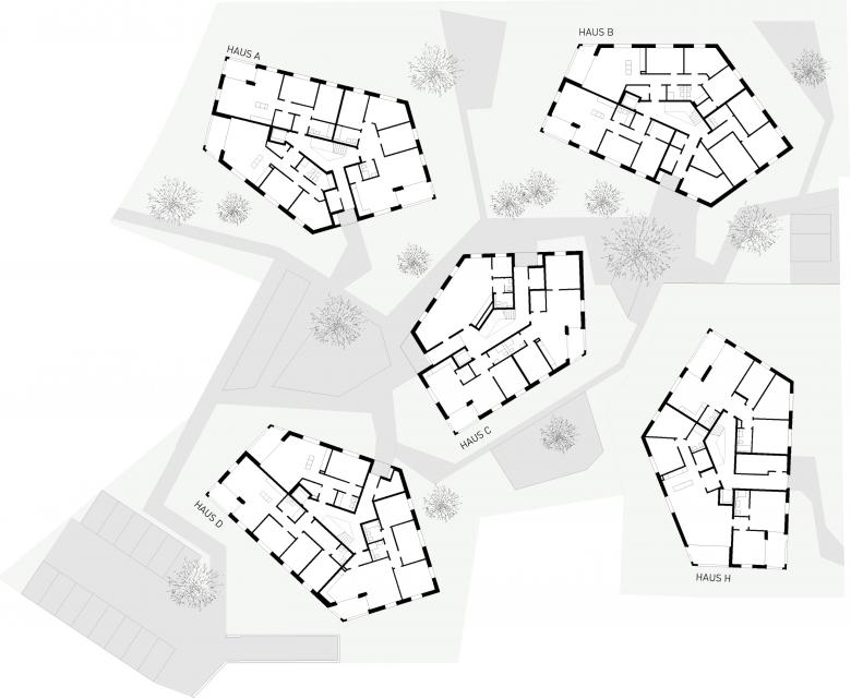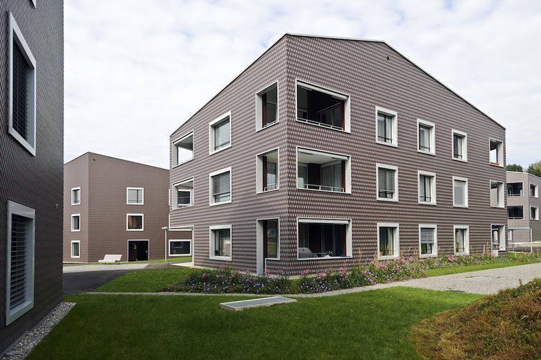Fünf monolithische Gebäude werden versetzt und verdreht auf das Grundstück mitten im Dorfzentrum gesetzt. Scharf geschnittene fünfeckige Baukörper und das Dach als sechste Fassade bestimmen die Gebäudeform. Die Anordnung der Häuser gewährt den Wohnungen mit den von den Wohnräumen besetzten Ecken unterschiedliche Ausrichtungen und Ausblicke. Indem sich die Baukörper wegdrehen, bilden sie keine unmittelbaren Fassadenfronten. Die Gebäude werden von kleinteiligem, rautenförmigem Fassadenschiefer in Grau, Schwarz und Rot nahtlos über alle fünf Fassaden eingehüllt. Aus der Ferne verschmelzen die Wabenstreifen oder erzeugen einen Moirée-Effekt, aus der Nähe wirken die Ecken je nach Belichtung scharf geschnitten oder lösen sich auf. Rückt man der Fassade noch näher, offenbart sie ein Strickmuster, dessen Reliefstruktur durch das Licht- und Schattenspiel besonders hervortritt. Unterstrichen wird die textile Wirkung durch die farbliche Musterung. Dank der Präzision der Fügung verschränken sich die Elemente des Fassadenschiefers auch an den Ecken, als wären sie gestrickt.