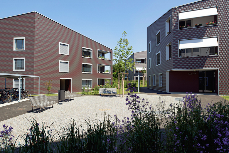 Das Zentrum der Anlage bildet das Gebäude mit acht Alterswohnungen und dem Gemeinschaftsraum. Insgesamt weist die Überbauung 42 Wohnungen mit 2.5 - 5.5-Zimmern auf.