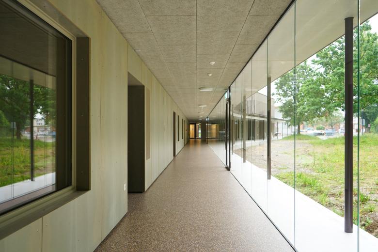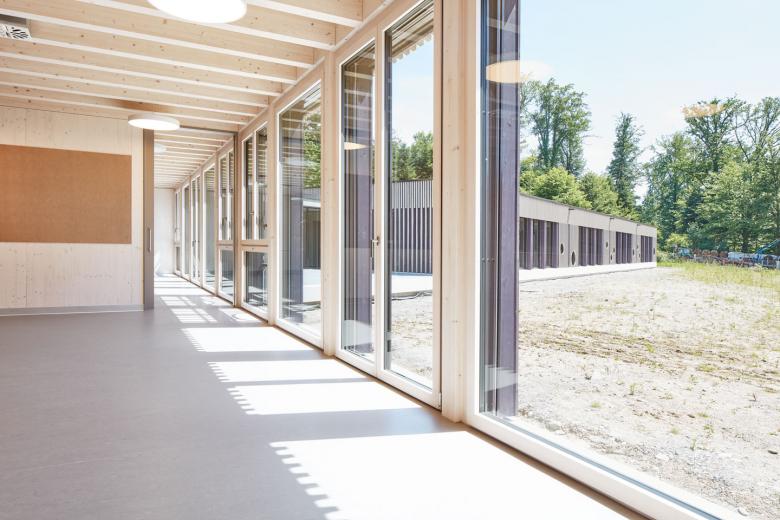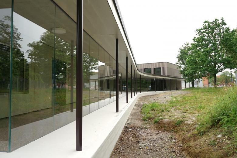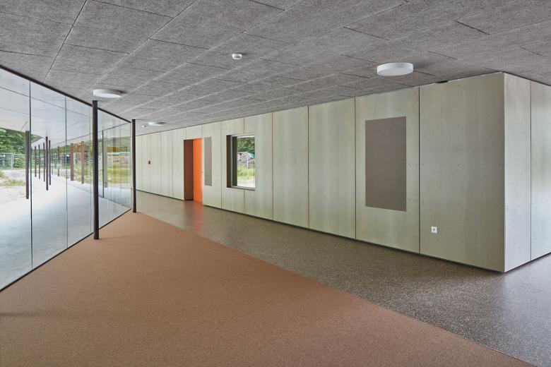 Die bestehenden Gebäude wurden rückgebaut und durch zwei neue Volumen ersetzt. Die beiden Körper sind durch ein grosszügiges Vordach verbunden. Es bietet gleichzeitig auch gedeckte Zugangs- und Spielmöglichkeiten.