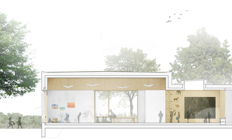 Jede Kindergartenabteilung wird für sich als ein separates Haus wahrgenommen. Als kreativ nutzbares Potential besteht jedoch auch die Option die drei Haupträume auf direktem Weg miteinander zu verbinden. Die Erschliessungsflächen dazwischen können flexibel genutz werden, da sie mehr sind als enge Korridore.