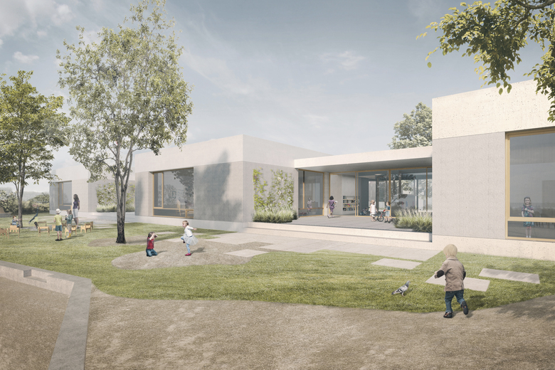 Von aussen wirkt das Gebäude mit seinem muralen Charakter und der differenzierten kubischen Gliederung eigenständig. Im Umfeld einer lockeren Gebäudeansammlung schafft es die nötige Verankerung und bildet eine klare Adresse. Die grossen wie auch die kleinen Dimensionen der Nachbarhäuser werden aufgenommen und architektonisch in einem Gebäude zusammengefasst. Die Passanten erleben einen Wechsel von geschlossenen und offenen Partien. Durch die transparente Garderobenschicht entsteht ein Einblick in die Kindergartenwelt und ein Durchblick in den Gartenbereich.
