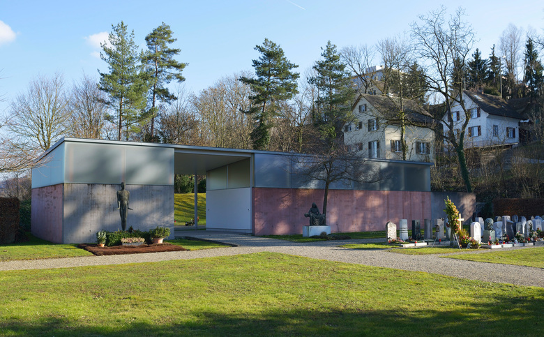 Das neu erstellte Gebäude mit Aufbahrungsraum und Serviceräumen steht als Tor zwischen altem Friedhof und neuem Gemeinschaftsgrab. Für die Westwand des Gebäudes, die gleichzeitig Friedhofsmauer ist, wurde an Ort gegossener, in verschiedenen Farben eingefärbter Beton verwendet. Der Aufbahrungsraum, eine mit Holz ausgekleidete und durch hochliegende Fenster belichtete Stube, strahlt Wärme und Ruhe aus.
