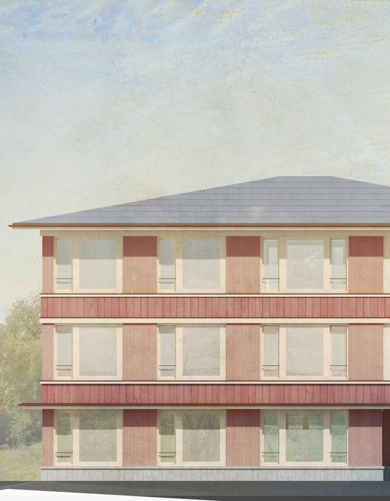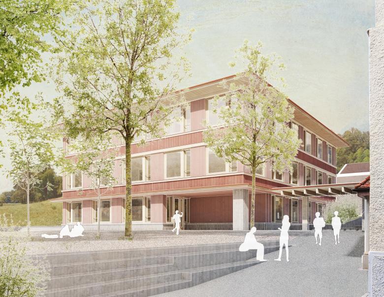 Der bestehenden Schule wird ein neues Schulhaus zur Seite gestellt. Die beiden Häuser stehen nicht in Konkurrenz, sie ergänzen sich. Dem Neubau kommt hier die Rolle des eigentlichen Schulhauses zu, es beherbergt im Erdgeschoss die beiden Kindergärten und in den beiden Obergeschossen die Klassenzimmer mit den Gruppenräumen. Situiert ist der neue Baukörper nordwestlich des Bestandsgebäudes. Damit wird zusammen mit dem Bestand ein Aussenraum definiert, der neu als Pausenplatz dient.