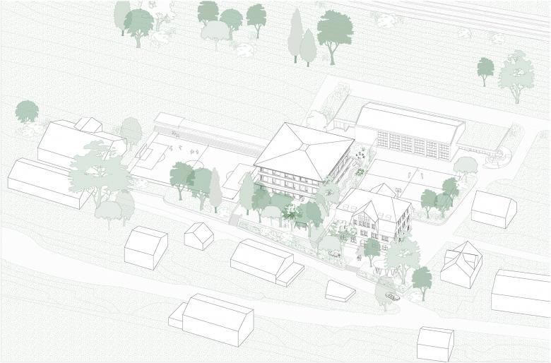 Mit der Setzung des Neubaus entsteht ein neues Schulensemble das dem bestehenden Schulhaus genügend Raum gibt und die verschiedenen Freiräume klar lesbar gliedert.