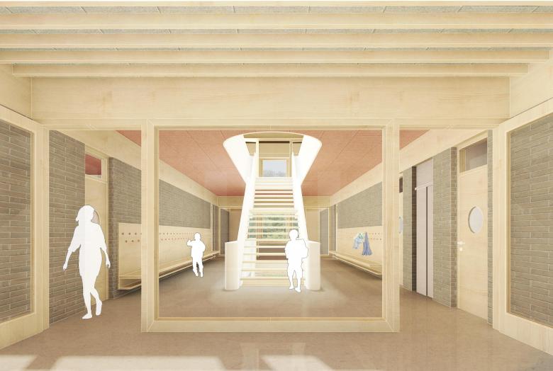 Ein gedeckter Zugangsbereich führt über den Windfang in die grosszügige Erschliessungshalle. Die durchlässige Treppe in der Mitte als verbindendes Vertikalelement, Garderoben an den Wänden und Sichtbezüge nach aussen charakterisieren diesen Bereich. In der Längsrichtung wird jeweils ein Gruppenraum oder ein Aufenthaltsbereich, welche auch als zusätzliche Gruppenräume genutzt werden können, angeordnet. Transparente Raumabschlüsse ermöglichen Ein- und Durchblicke. Sie können bei Bedarf mit Vorhängen optisch getrennt werden. Ein grosses Oblicht im Dach bringt viel zenitales Tageslicht in den Erschliessungsbereich.