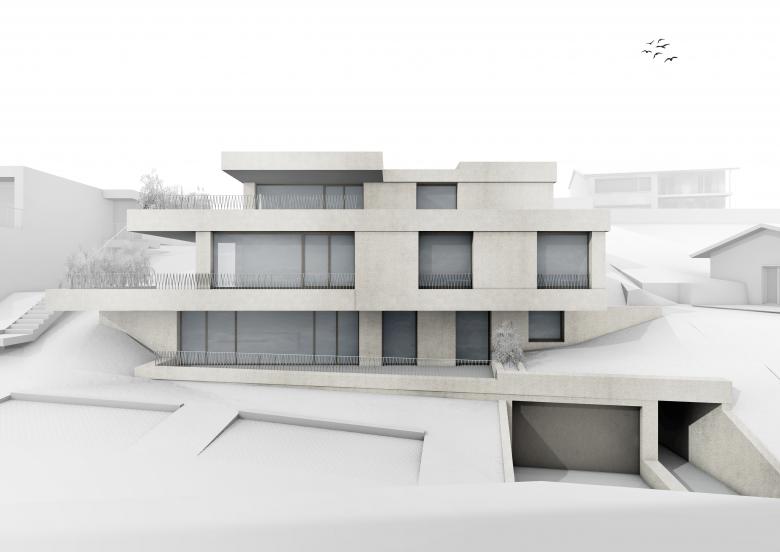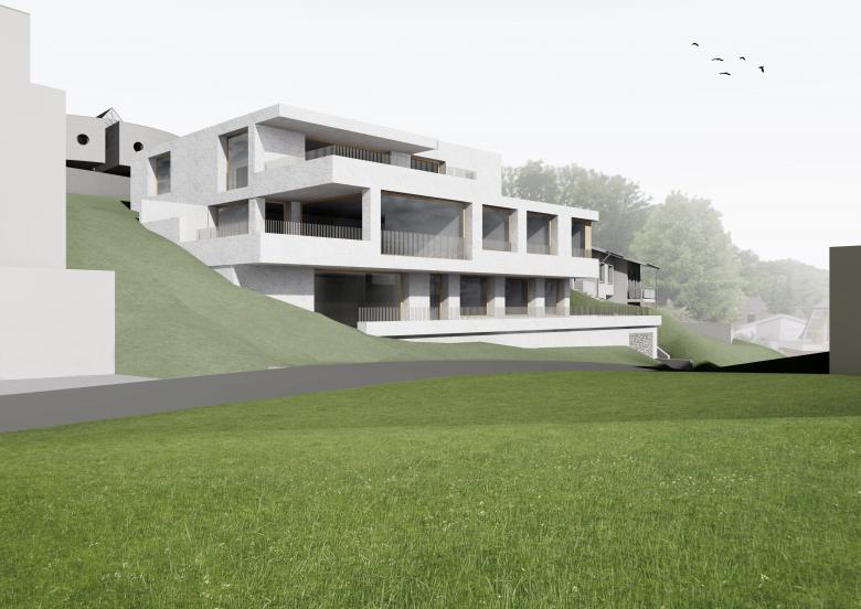Das Wohnhaus liegt an einem teilweise steil abfallenden, teilweise flachen Hang. Es ist so in das Gelände eingebettet, dass alle Wohnungen einen direkten Zugang zum Terrain haben und die Aussicht für die umliegenden Gebäude minimal beeinträchtigt. Das Garagengeschoss folgt dem Strassenverlauf, die Wohngeschosse richten sich nach dem Hang und der Bebauungstypologie der Umgebung.
