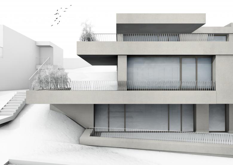 Die Aussenfassade wird in Sichtbeton erstellt. Dadurch wird das Volumen gefasst und vereinheitlicht. Vorgesehen ist, dass die Oberfläche des Betons eine Behandlung erhält. Grosse Öffnungen durchbrechen die teilweise flächige Fassade und geben dem Gebäude dadurch eine gewisse Leichtigkeit.