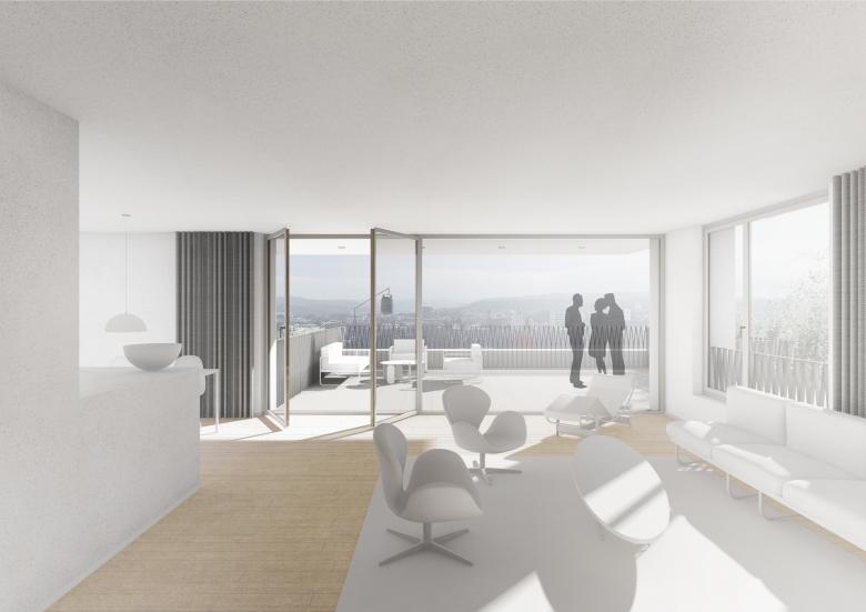 Die Wohnungen sind geschossweise angeordnet und funktionieren im Grundsatz ähnlich. Erschlossen sind sie über ein rückseitig angelegtes Treppenhaus mit Lift. Alle Einheiten verfügen über grosszügige, gedeckte und ungedeckte Aussenflächen. Sie sind versetzt angeordnet, was auch im Aussenbereich Privatsphäre schafft. Panoramafenster in den Wohn- und Essbereichen ermöglichen die Aussicht auf die Stadt Aarau und Umgebung.