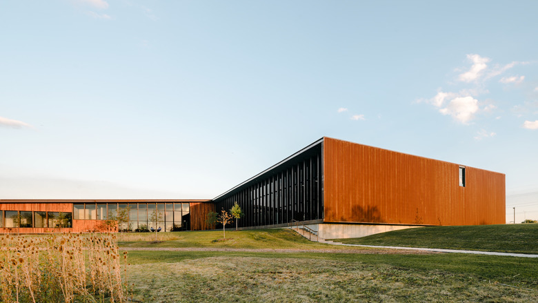 Das Äußere des Gebäudes mit seiner roh wirkenden Verkleidung aus tief rostrotem Cortenstahl-Trapezblech und seinen eleganten, gebäudehohen Verglasungen macht sowohl den industriellen Kontext als auch die repräsentative Funktion deutlich. Im Innern schaffen industrielle, rohe Materialien mit veredelten Oberflächen eine warme, beinahe wohnliche Atmosphäre. Die Konstruktion aus schwarzem Stahl, polierte Betonböden, Deckenverkleidungen aus Streckmetall und Wandverkleidungen aus geflammtem Douglasienholz prägen Räume, in denen geführte Rundgänge und Präsentationen ganz selbstverständlich neben industrieller Arbeit stattfinden können.