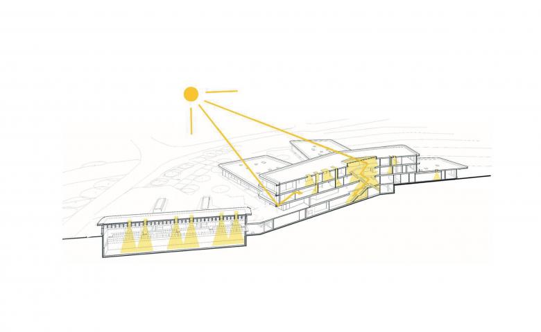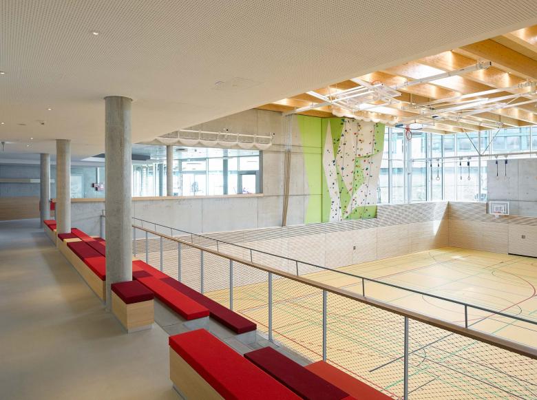 The main aim of the architectural concept was to create a space that would cater to potential developments in education in the coming years. It was important for the structure to be flexible enough to allow a curriculum to be delivered during a phase of didactic transition. The design is intended to promote a strong sense of identity, while integrating smoothly into the existing school campus. A schoolyard located in the center of the campus is shared with the adjacent grammar school, the Paul Klee Gymnasium. The spacious area offers the students of both schools room for lunchtime or afternoon activities. The site’s topography was used to maintain the north-south axis passing across the traffic-free school area and made it possible for this axis to be redesigned in a way that would be disability friendly.