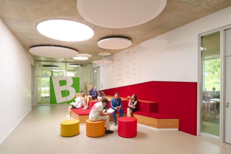 On the two upper floors, the individual wings of the building are subsumed into a free-form, compact structure consisting of two stories. On each story, there are six clusters or classroom spaces, each catering to two classes with group rooms and their own entrance area: this promotes the idea of a school community, which is reinforced by the annular arrangement of the rooms around the auditorium. The galleries on the upper floors make the building easy to navigate. This creates an informal setting where teachers, students, and parents can meet to talk and exchange information.