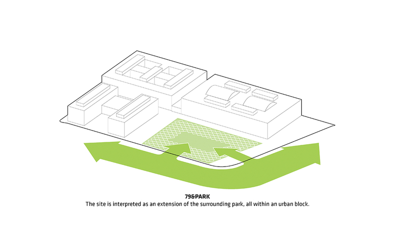 Located on the edge of Gärdet, a treasured national park, Kullen makes conscious decisions to provide a sensitive, respectful form while allowing the same choices to simultaneously manifest as exceptional residences with spectacular views. In direct response to the context, the northwest and southeast corners take the heights of their immediate neighbors; while the northeast corner, farthest from the park and nominally with the worst view, is pulled upwards to grant it the most spectacular views of park and port. The southwest point of the building extends farthest into Gärdet; and to create a humane edge between building and nature, is pushed down to the lowest profile, transforming it into a public platform with a 270 degree view of parkscape and simultaneously freeing the majority of the residential units to views of the park. The same move also ensures that the central courtyard will always receive copious amounts of sunlight. In further deference to Gärdet, the massing is visually reduced through a language of pixels, scaled to the human form. This manipulation not only allows for a more organic expression, perfectly reflecting the surrounding landscape, but also provides a way to accomplish the building topography in a controlled and inexpensive way through the use of prefabricated units of standardized sizes.