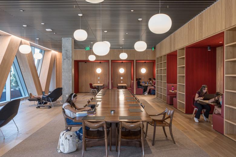 Throughout the building, warm wood cladding and concrete floors are accented with the school's signature colors of red and gold. The BIG-designed interiors are designed to accommodate future scientific innovation, incorporating elements such as reconfigurable classrooms and modular seating.