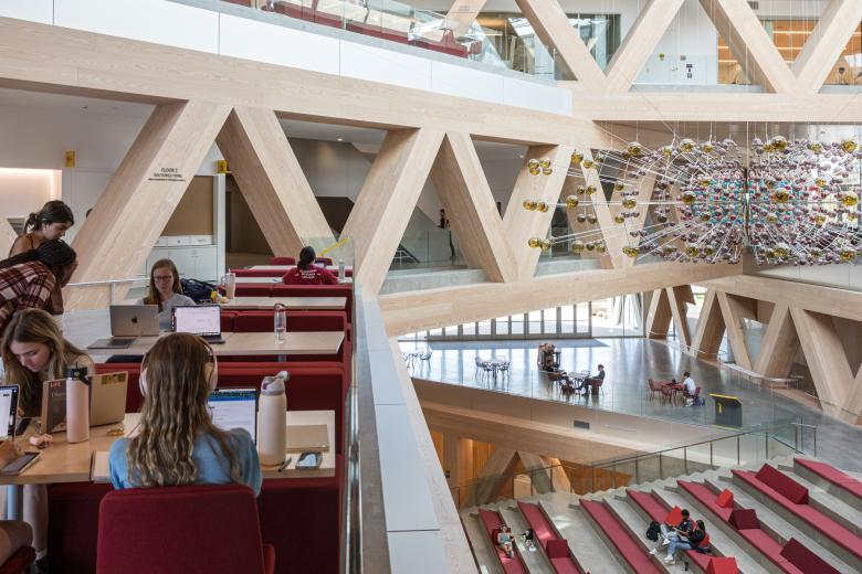 The ground floor includes the McElwee Forum, a large seminar space, and imaging suites, while classrooms, research spaces, dry and wet labs, the Quantum Library, and a maker’s space are located on the upper floors. Classrooms are organized around the perimeter of the building, offering picturesque views while keeping them separate from the atrium and social spaces below.