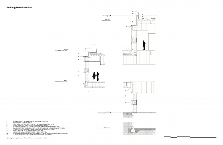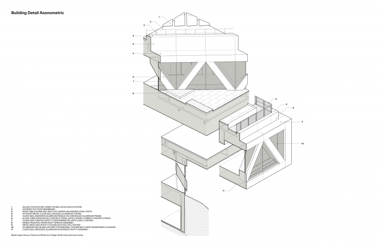 The building's structure is designed as a stack of two volumes, with each pair rotated 45 degrees from the floor below. The voids of the rotated blocks create the full-height atrium at the heart of the building, which provides direct views into classrooms and research spaces from all levels. The open spaces within the atrium invite collaboration, embodying the center's architectural and educational approach. The facade incorporates board-formed panels of glass fiber reinforced concrete, which create a wood-like texture while providing the durability and fire resistance required for a modern laboratory. The roof’s 11,000 sq ft of solar panels provide about 342 megawatt hours of energy production per year.