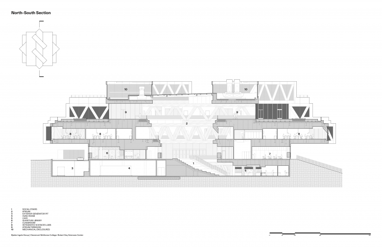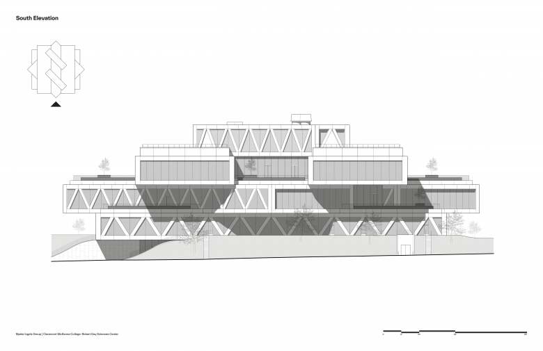 Commissioned in 2020, the Robert Day Sciences Center serves a community of 1,400 students. The center is BIG’s first built project in Los Angeles, and the first completed building in the BIG-designed masterplan for CMC’s Roberts Campus, which envisions a more unified campus shaped by a series of buildings that extend the central mall and adjacent sports bowl currently under construction. Collaborators on the Sciences Center include Saiful Bouquet as Structural Engineer, KPRS Construction as General Contractor, and IDS Real Estate Group as Construction Manager.