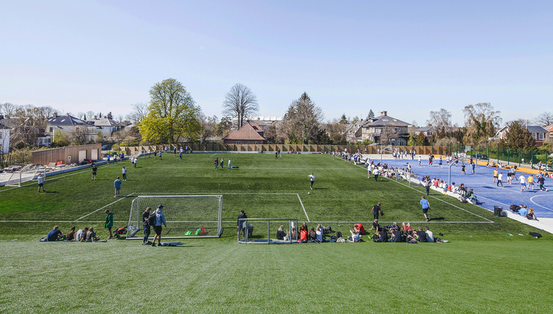 During the construction of the hall, the school planned a new building, located between the school’s multi-purpose hall and adjacent football fields. This new arts building seeks to connect the sports areas with the gymnasium’s existing educational facilities in one continuous flow. By placing parts of the new building beneath the football fields, the students are able to walk through the sunken sports hall at the center of the school´s courtyard, to the classrooms, cafeteria, and out to the main entrance at street level. Additionally, the new facilities situated underground form the roof of the new arts building, extending the football fields into a green carpet for informal activity and to serve as informal seating overlooking future sporting events.