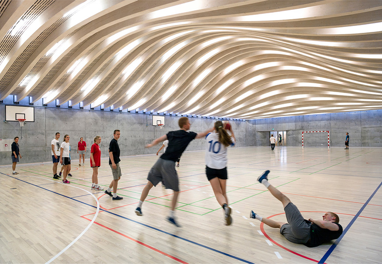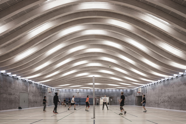 Originally a building adjacent to the campus, the gymnasium facilities became insufficient; Gammel Hellerup High School lacked a large multi-functional space for physical activities, graduation ceremonies and social gatherings. In response, BIG designed a multi-purpose hall for the physical education and social development of the students, drawing its signature curve from the physics of a handball being thrown. Placed 16.5 feet (5 meters) below ground in the school’s courtyard, the hall is passively temperature controlled and does not impose on its context. Above ground, the hall’s softlycurved roof is an informal meeting place. The edge of the roof is designed as a long social bench, perforated with small windows to provide natural daylighting below. The shape of the roof is based on the formula for a ballistic arc. Form follows formula!