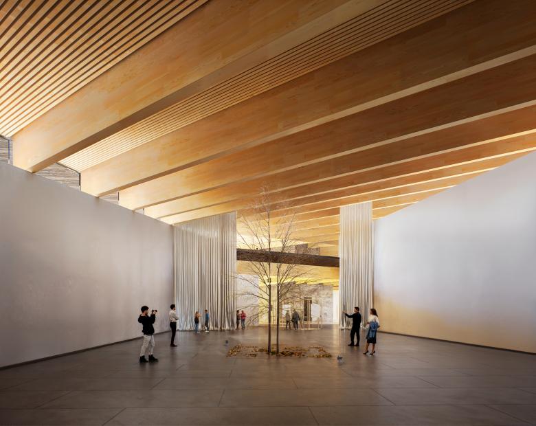 The new museum is defined by three overlapping volumes that rise and fall with the landscape. With a mass timber structure and charred timber facade, the museum is partially sunken into the ground and rises from the forest floor to visually blend into its park surroundings, while its sloping roofscape invites public access and offers expansive views of the city.
