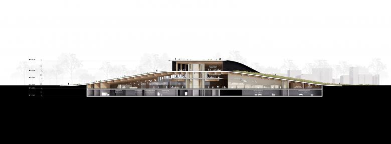Minimizing its footprint, the museum is partially hidden in the terrain. The sloping green roofs are planted with native species, offering habitats for local flora and fauna while visually extending the park over the museum. Vegetation continues through the site and into the building, offering areas for rest and gatherings for the public year-round.