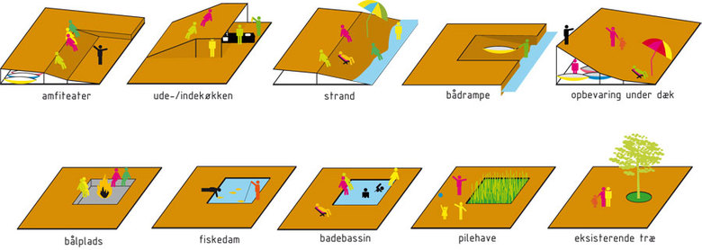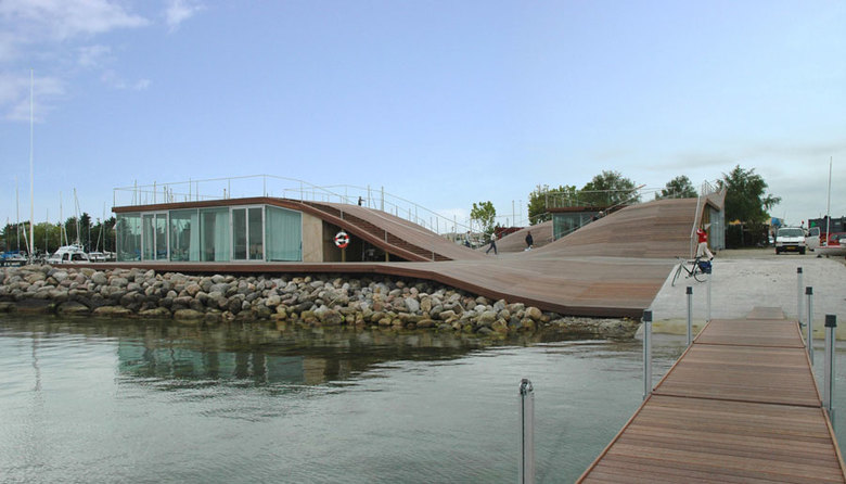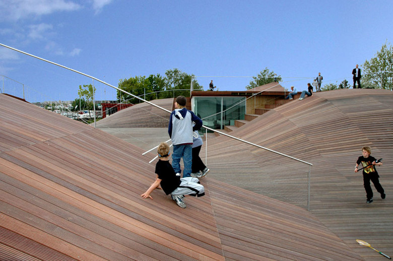 Two very different users had to share the facilities: a sailing club and a youth centre with conflicting requirements: the youth centre wanted outdoor space for the kids to play; the sailing club required most of the site to moor their boats. The building is the result of these two contradictory demands: The deck is elevated high enough to allow for boat storage underneath while providing an undulating landscape for the kids to run and play above.
