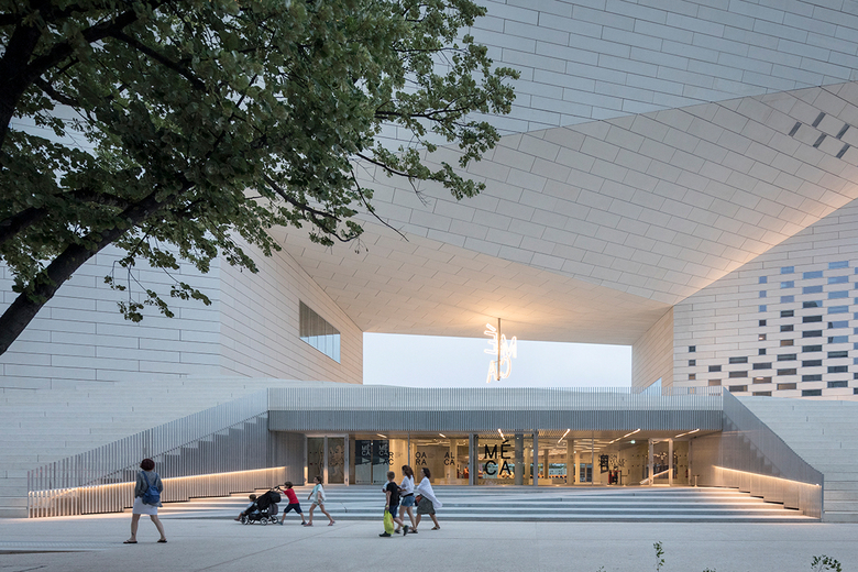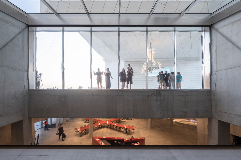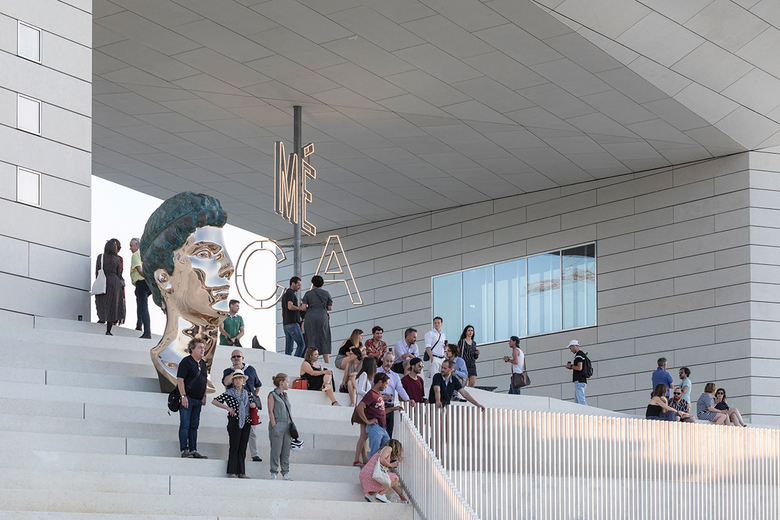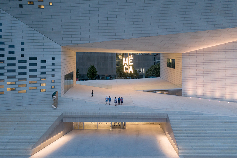 The building is conceived as a single loop of cultural institutions and public space by extruding the pavement of the promenade to become the ramp that leads into the urban living room, the façade with glimpses into the stage towers of OARA and the offices of ALCA, and the rooftop enclosing the sky-lit galleries of FRAC. A series of steps and ramps lead the public directly into the 1,100 m2 outdoor urban room at the core of MÉCA, creating a porous institution for visitors to roam freely between the Quai de Paludate street to the river promenade. A 7m high MÉCA sign illuminates the space with white LED lights, like a modern chandelier at the scale of the urban room. During special occasions, MÉCA’s outdoor spaces can be transformed into a stage for concerts and theatrical spectacles or an extended gallery for sculptures and other art installations. A permanent bronze sculpture depicting a half-head of Hermes by French artist Benoît Maire intersects with the entrance on the riverside, inviting visitors to reflect on the contemporary culture of the region.