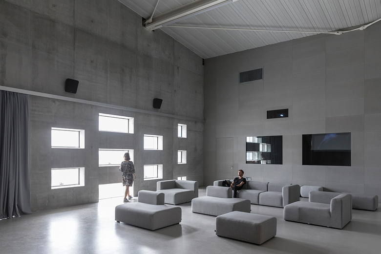 Upon entering MÉCA from the ground floor, visitors arrive at the lobby where they can relax in the spiral pit or dine at the restaurant Le CREM, furnished with red furniture and cork chairs designed by BIG in reference to the city known for wine. A giant periscope by the restaurant and elevators allows visitors to see the activity in the outdoor urban room and vise-versa, creating an indoor-outdoor dialogue. On the same ground floor, those with tickets can enjoy performances in OARA’s 250-seat theatre featuring flexible seating configurations and acoustic systems optimized by an all-black checkerboard panel of concrete, wood and perforated metal. Upstairs, filmgoers can view screenings at ALCA’s red-accented 80-seat cinema or visit the two production offices and project incubation area.